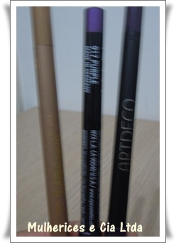 Lapis dourado Revlon, lápis roxo NYX e lápis roxo Artdeco.
